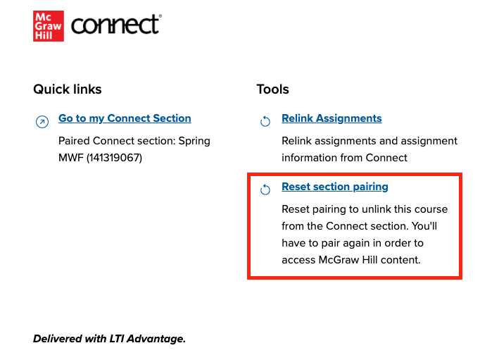 If you paired the wrong Connect section with your LMS, you can always unlink the section using the LTI Advantage widget. Locate the LTI Advantage tool link in your LMS and launch it. In the LTI Advantage widget, click on