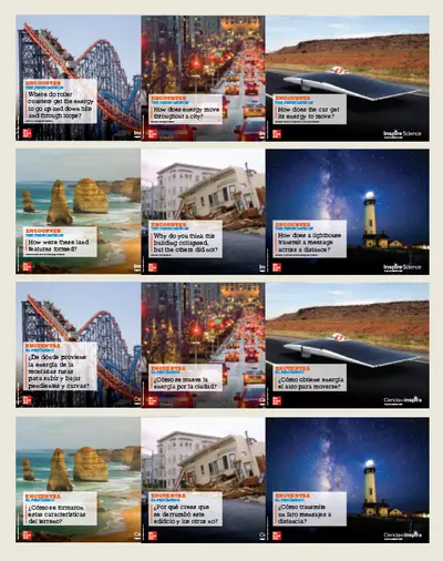 Inspire Science poster packs, one side English and the other Spanish, encourage students to interact with each anchoring module phenomenon they encounter with Inspire Science.