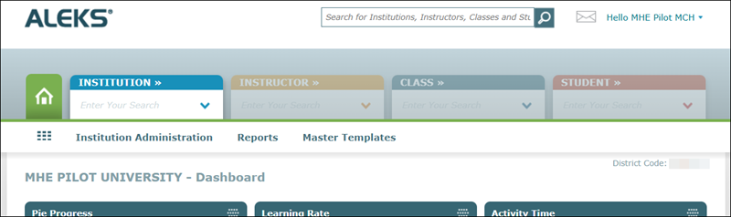 ALEKS will then open in a new tab. The Institution Administration, Reports, and Master Template links appear on the menu bar below the Main Navigation tabs.