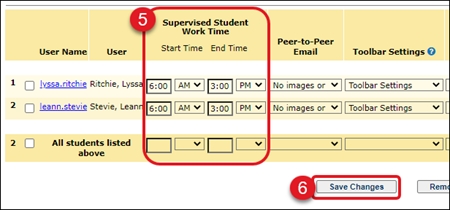 5. Under the Supervised Student Work Time column, use the drop-down boxes next to each student to edit the Start Time and End Time. To edit all students at once, you can use the drop-down boxes in the All students listed above row at the bottom.