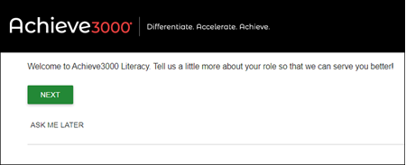 3. To finish setting up your Achieve3000 Literacy profile, select the Next button to answer a few questions about your role with your school.