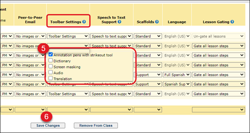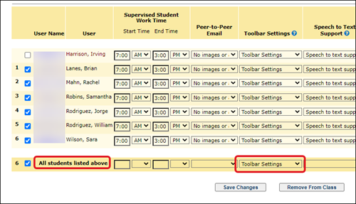 5. In the Toolbar Settings column, for each student select from the drop-down which tools you would like them to have access to when completing their lessons.