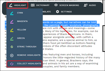 To view any highlights made throughout the article, highlight any text in the article. On the pop-up menu, select Highlight then select Collect Highlights. All highlights will be listed in the order they were created, and grouped by color selected.