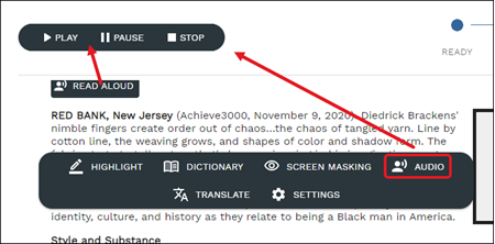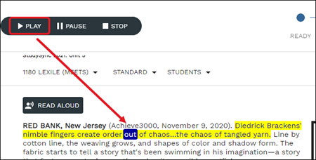 Both options will bring up the play bar at the top of the Lesson. Use the Play, Stop, and Pause buttons to have the text read aloud. As the text is read, the words will be highlighted as it navigates through the text.