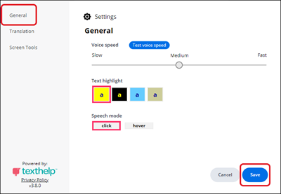 To change the Voice Speed and Text Highlight colors, select Settings from the Lesson Tool Menu. Then, select the General tab. Click the Save button to save any changes made.