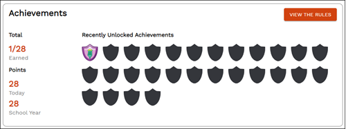 The Achievements section will display the Badges students have earned in the program, whether they are automatically awarded by the program or manually awarded by a teacher. Students can also view the number of points they’ve earned for the current day as well as the current school year.