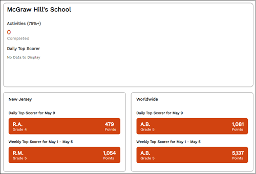 The highest-scoring classes within the school are reported daily, while the state/territory and worldwide highest scorers are reported both daily and weekly. This portion of the Student Scoreboard will also show the student how many lessons they have completed with a first-try score of 75% or higher during this current school year.