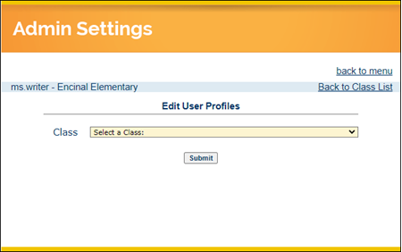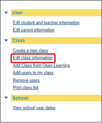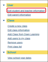 4. From the User section, click on the Edit student and teacher information link. Select the Class you want to edit from the drop-down. Click the Submit button.