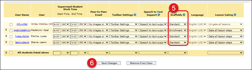 You can also make changes to the Scaffold options by clicking on the student's name in the User Name column. On the Edit User page, in the Scaffolds section, check the box next to the Scaffold option you want for the student. Click the Submit button at the bottom to save the changes.