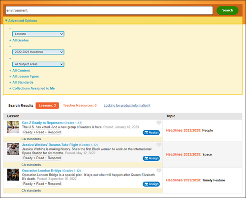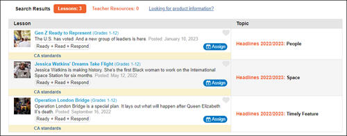 In the Search Results section, you can click on the Title of the article to open the lesson, click the Assign button to assign the lesson to individual students or the class, click the Heart icon to favorite the lesson, or click the Topic to view additional lessons for that selected Topic.