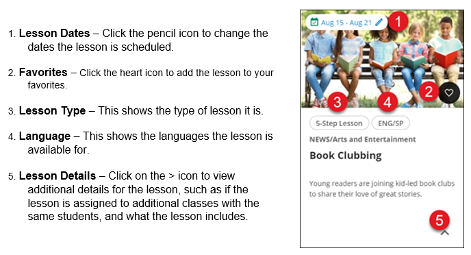 - Lesson Details – Click on the > icon to view additional details for the lesson, such as if the lesson is assigned to additional classes with the same students, and what the lesson includes.