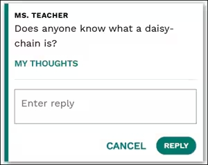 Students can respond to notes shared with them by other classmates and/or the teacher by clicking on the note, entering their reply, and clicking the Reply button.