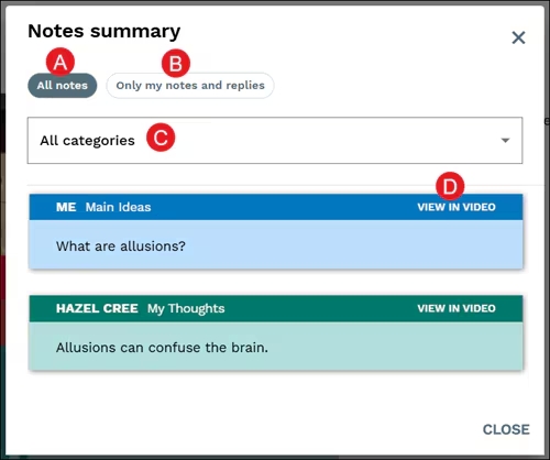Students can view a summary of all the notes that they created as well as any notes that were shared by other classmates and the teacher. The notes can also be printed if needed.