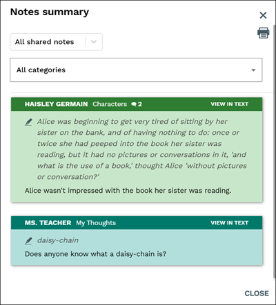 Click the All shared notes drop-down (B) to view a specific student's notes.