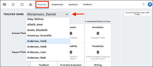 This overview section tracks different data points for each individual teacher for all of their classes.