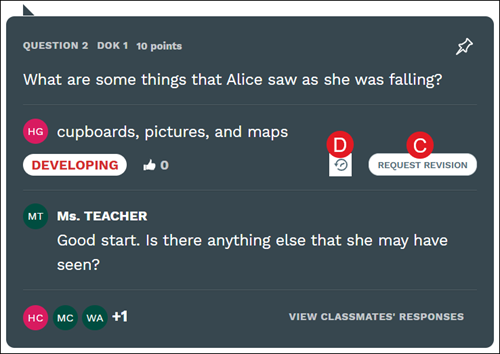 Students can also Request Revisions (C) and View previous responses (D) they provided for the question.