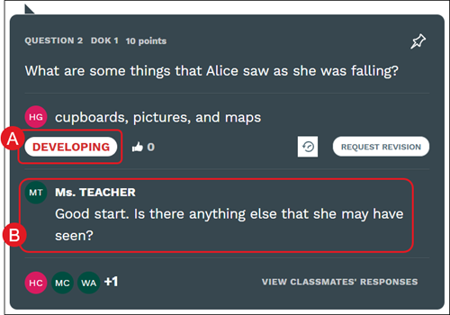 When grading (A) and feedback (B) is provided for a question, students will see it immediately within the assignment.