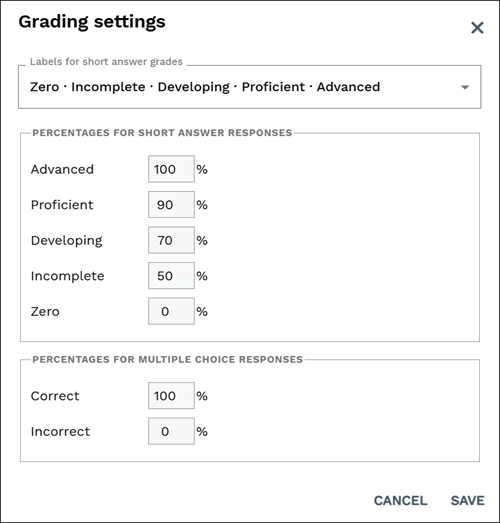 Actively Learn uses Marzano's Standard Based Grading. Teachers can make changes to the labels that appear for short answer responses and customize the point values by going to Edit grading settings.