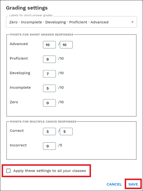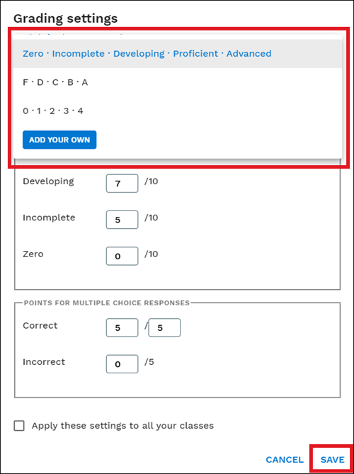 Note: Updating the grading settings for your class will affect any past assignments you have already graded.