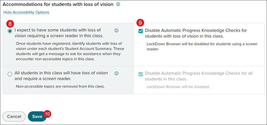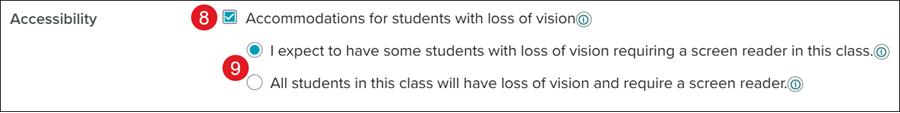 Accessibility at the Class Level: If all students in the class are visually impaired and require a screen reader, select this option.