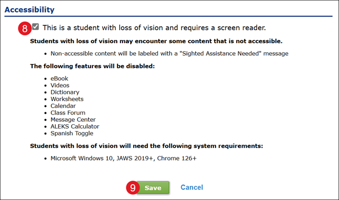 8. In the Accessibility section, checkmark the Accommodations for students with loss of vision box.