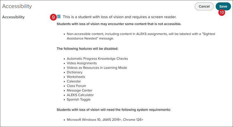 The course setting Accommodations for visually impaired students appears for select ALEKS course products, which include content that has been rewritten and coded to conform to screen-reader technology and level AA Web Content Accessibility Guidelines (WCAG).