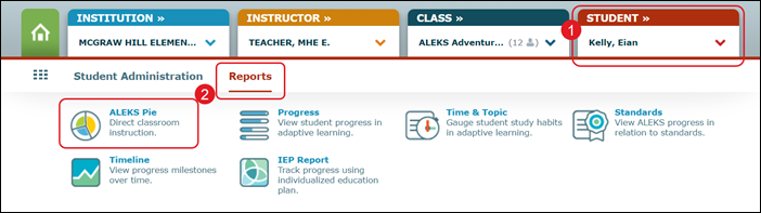 1. Select the student from the Student drop-down.2. Hover over Reports and click on ALEKS Pie from the drop menu.