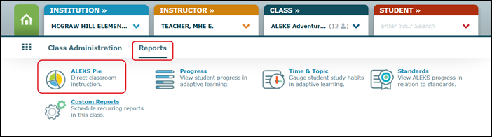 4. Hover over Reports and select ALEKS Pie from the drop menu.