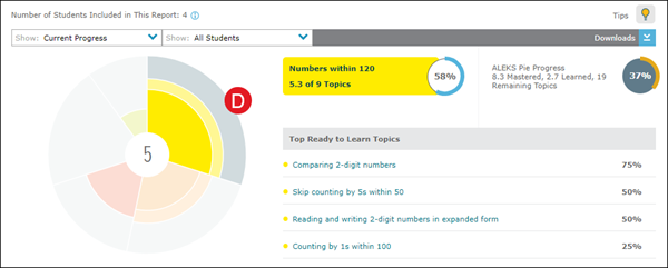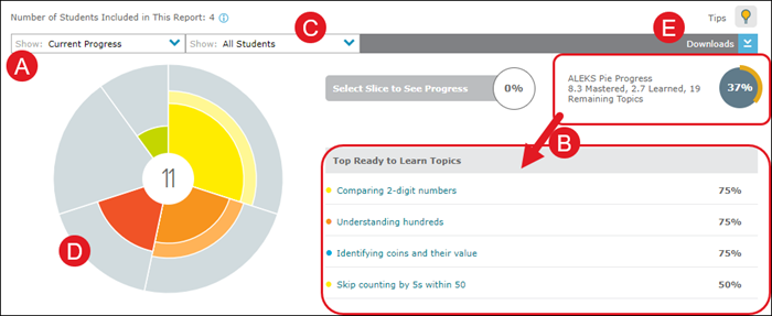 B. The ALEKS Pie Progress section at the top right of this report shows information about your class as a whole. In the example below, the class has progressed through 75% of the content on average. The topics with the highest percentage of students ready to learn are listed next, under Top Ready to Learn Topics.