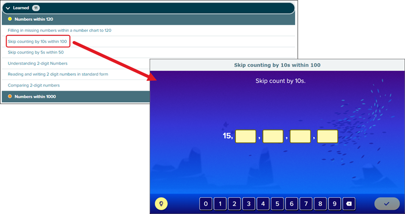 F. Learned means the student has demonstrated an understanding of these topics in Learning Mode but hasn't yet mastered them in an assessment. An upcoming assessment will determine whether each topic becomes Mastered or if the student needs to learn them again.