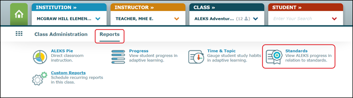 It can also be accessed by selecting a student's name from the Student drop-down at the top of ALEKS after selecting a class. You will then hover over the Reports option and select Standards from the menu.