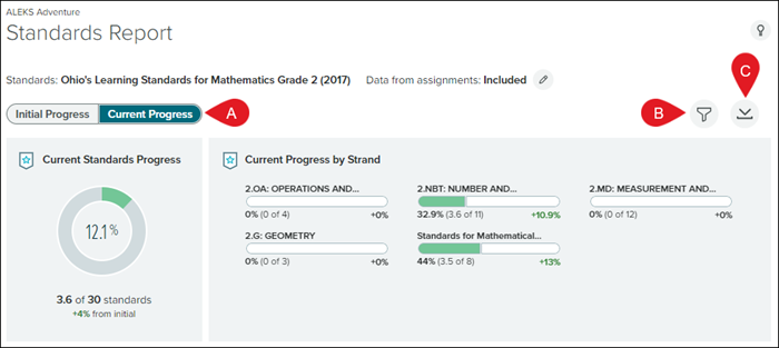 The class-level Standards Report shows the average student completion of standards-aligned ALEKS Adventure topics in the class. It can be used to monitor students' progress in state standards based on their completion of standards-aligned ALEKS topics in Knowledge Checks and Learning Mode.