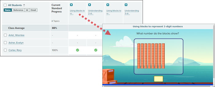 The Student Standards Report can be accessed through the class Standards report by clicking on a student's name and then clicking on the View Student Standards Report link in the right-side panel pop-up.