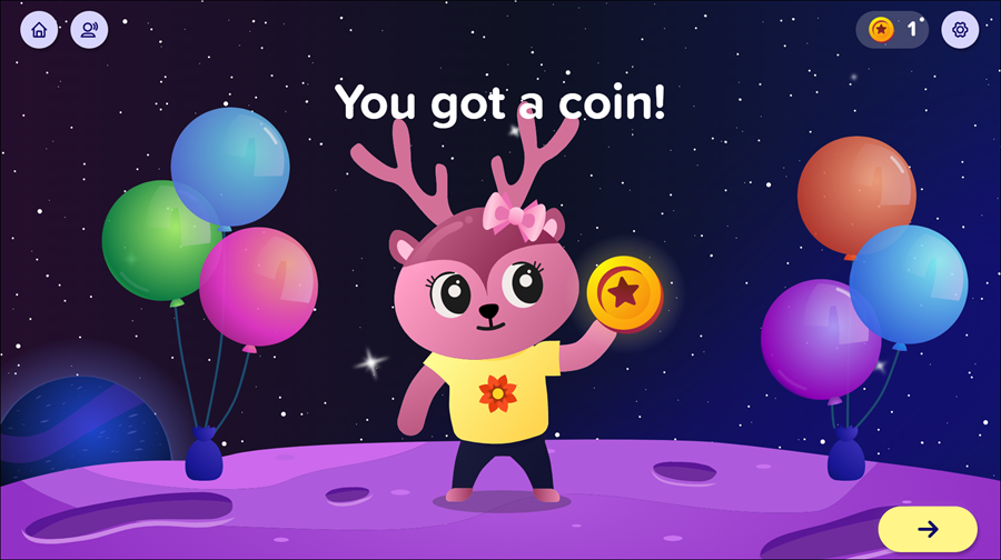 When a student completes a topic successfully or a Progress Knowledge Check, they receive a Coin. Coins can be used to purchase items in the Store, such as new outfits or upgrades to their ship. The number of coins a student has is shown next to the Coin icon in the upper right-hand corner of the page when they are not on a Map or a Topic.