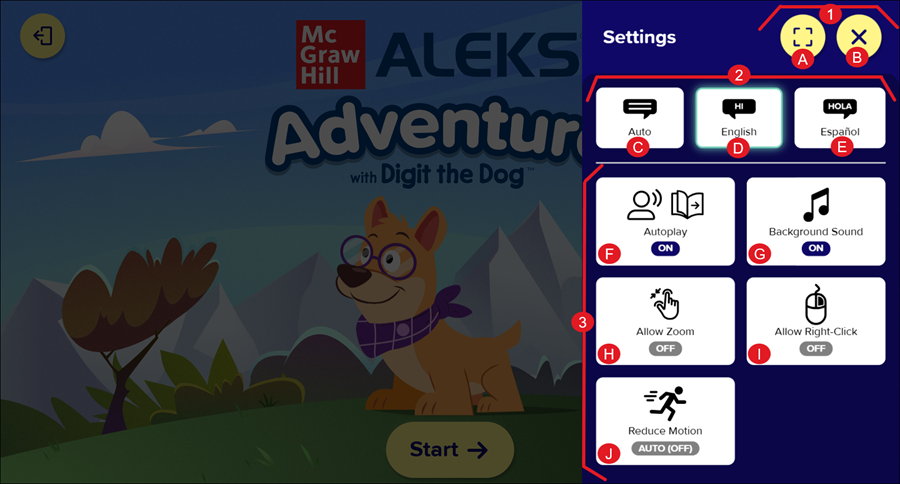 J. Reduce Motion (AUTO Default (OFF)): Turning this setting on freezes all animation in ALEKS Adventure so that any swiping or looping motion becomes inactive.
