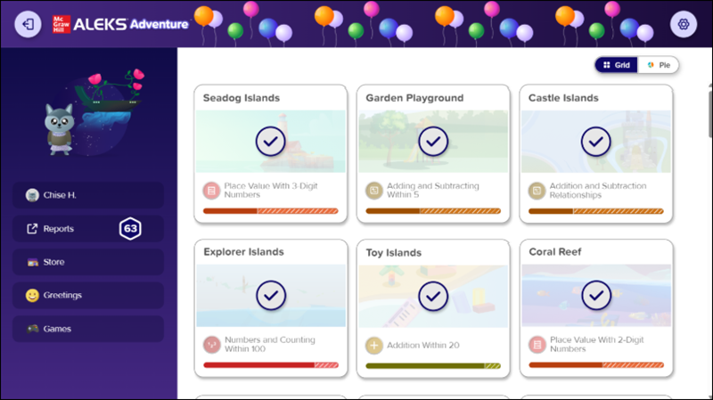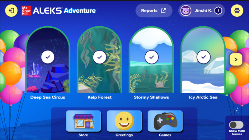 • Greetings: Students can access the Greetings page by selecting Greetings from the ALEKS Adventure Homepage. They may send one greeting a day, with each day’s greeting unlocking at midnight.