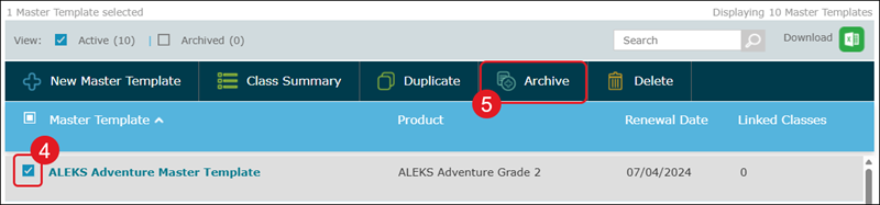 Archive an ALEKS master template to remove it from active use while preserving data.