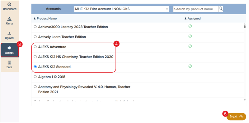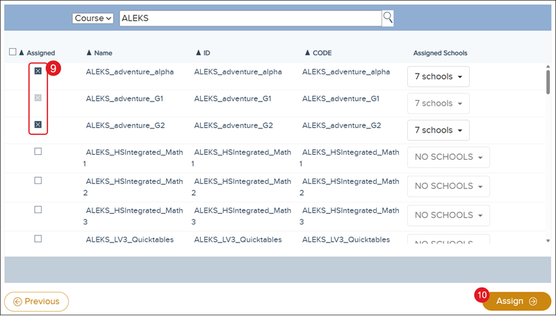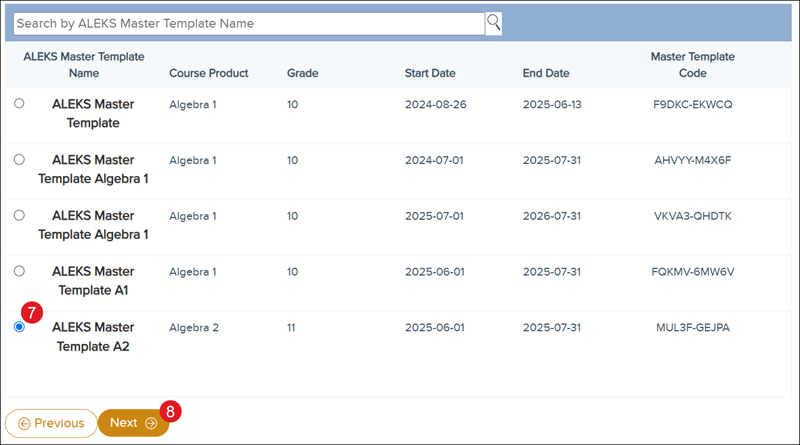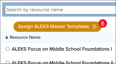 7. Select the radio button next to the ALEKS Master Template Name you want to assign.