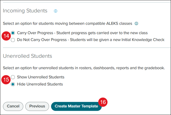 These options apply ONLY to incoming students who have previously enrolled in another ALEKS class within the same course family or with the same course product.