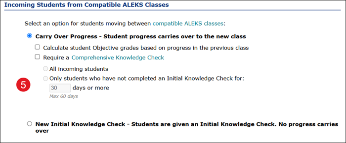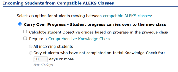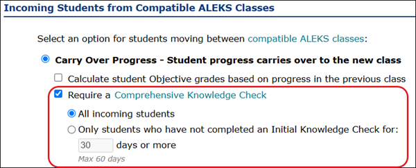 Even if you want students to get a new knowledge check when the new school year begins, it might be a good idea to change the setting back to Carry Over Progress later. Otherwise, students will be required to take a new Initial Knowledge Check or Comprehensive Knowledge Check even if they are transferred between sections during the school year, which can be frustrating for students and teachers.