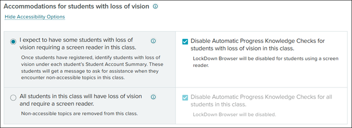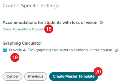 18. In the Course Specific Settings section, click the Show Accessibility Options link to expand the Accommodations for students with loss of vision options.