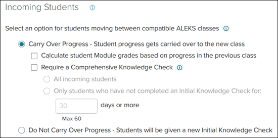 These options apply ONLY to incoming students who have previously enrolled in another ALEKS class within the same course family or with the same course product.