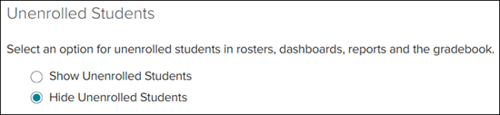 15. In the Unenrolled Students section, select the radio button to Show or Hide Unenrolled Students from rosters, dashboards, reports, and the gradebook.