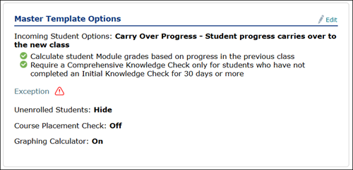 The Master Template Options shows the selections that were made for incoming Student Options, Unenrolled Students, Course Placement Check, and Graphing Calculator.