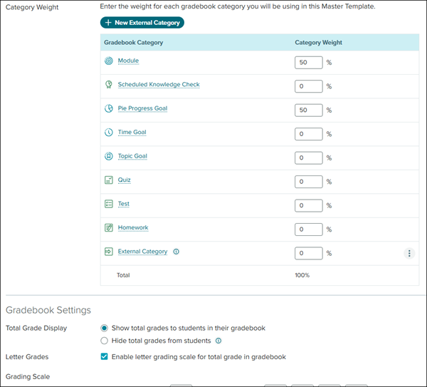 The Gradebook section allows you to create/attach a gradebook for any classes attached to the template.