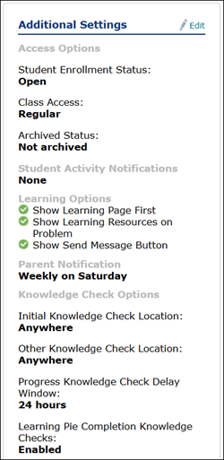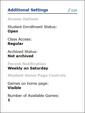 The Additional Settings include information on if Student Enrollment is active or inactive, the Class Access type, and the Archived Status.