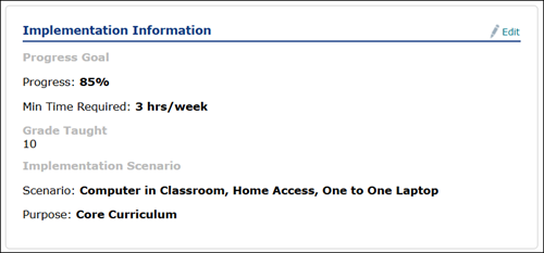 The Implementation Information section provides the Progress Goal percentage, Minimum Time Required that students have to work in the program each week, the Grade level the class is geared towards, and the Implementation information for the course.