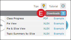 E. Click Downloads to download the Class Progress, Pie View, Pie & Slice View, or Topic Summary by Slice.