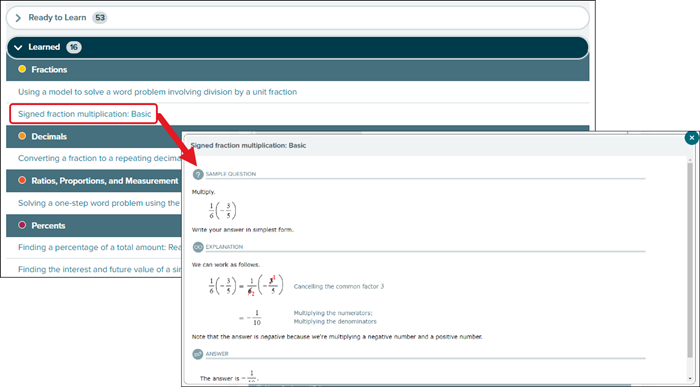 F. Learned means the student has demonstrated an understanding of these topics in Learning Mode but hasn't yet mastered them in an assessment. An upcoming assessment will determine whether each topic becomes Mastered or if the student needs to learn them again.