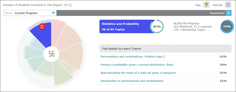 B. The ALEKS Pie Progress section at the top right of the report shows information about your class as a whole.